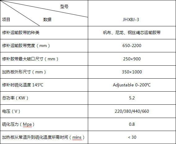 膠帶輸送機(jī)在運(yùn)行過程中,由于物料中含異物或機(jī)械本身故障,會發(fā)生較長距離的沿膠帶縱向的撕裂。利用JHXBJ-3型電熱式膠帶修補(bǔ)器,可迅速有效地修復(fù)膠帶的縱向撕裂,另外本廠可根據(jù)用戶的需求,生產(chǎn)特殊規(guī)格的修補(bǔ)器械。